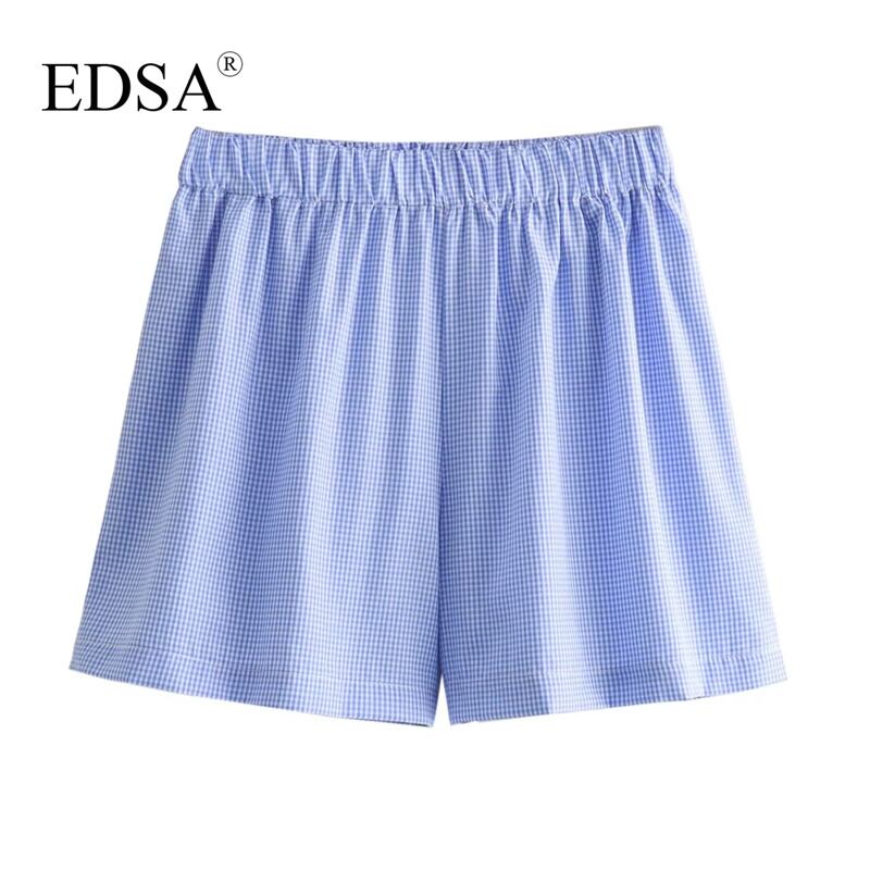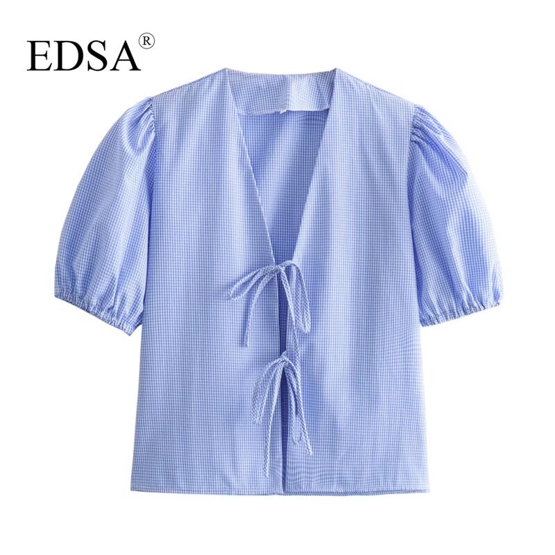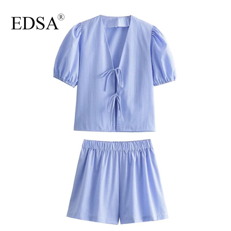 女性用ブルーチェックシャツ,レースアップ,Vネック,ハイウエスト,伸縮性ショーツ,カジュアル,ストリートウェア,ファッショナブル