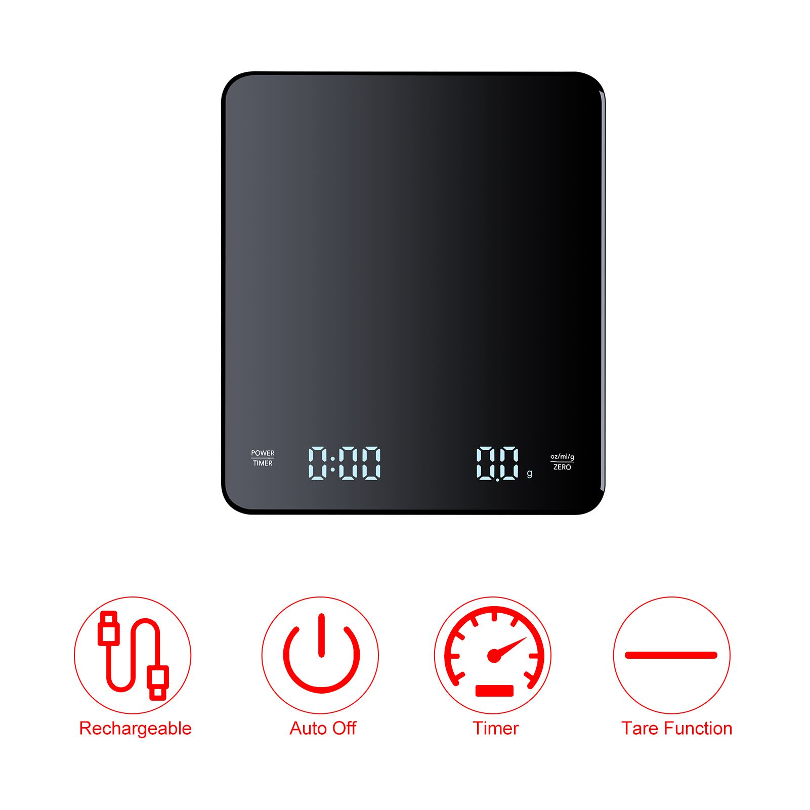 [単位変換]:タイマー付きキッチンスケールは、3単位の測定値(g/oz/ml)を備えており、いつでも変更でき、固体、液体、粉末の計量をサポートします。