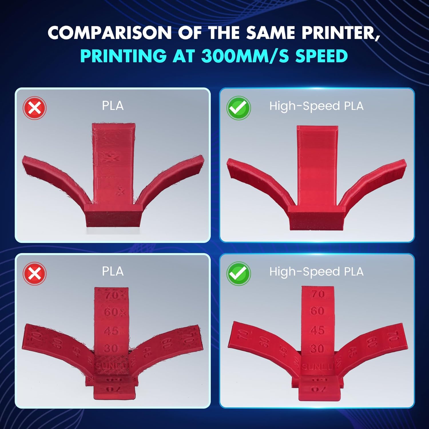 Sunlu高速プラフィラメント1.75mmは、驚異の30ミリメートル/秒から600ミリメートル/秒までの高速印刷を可能にし、あなたの制作を加速します。滑らかな表面仕上げと優れたオーバーハング性能で、高速印刷でも品質を落としません。枠外サポートが不要なため、時間と材料の節約にも一役買います。