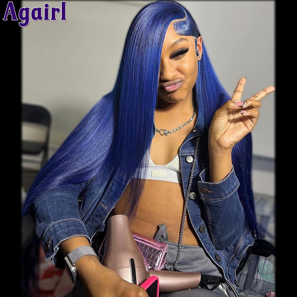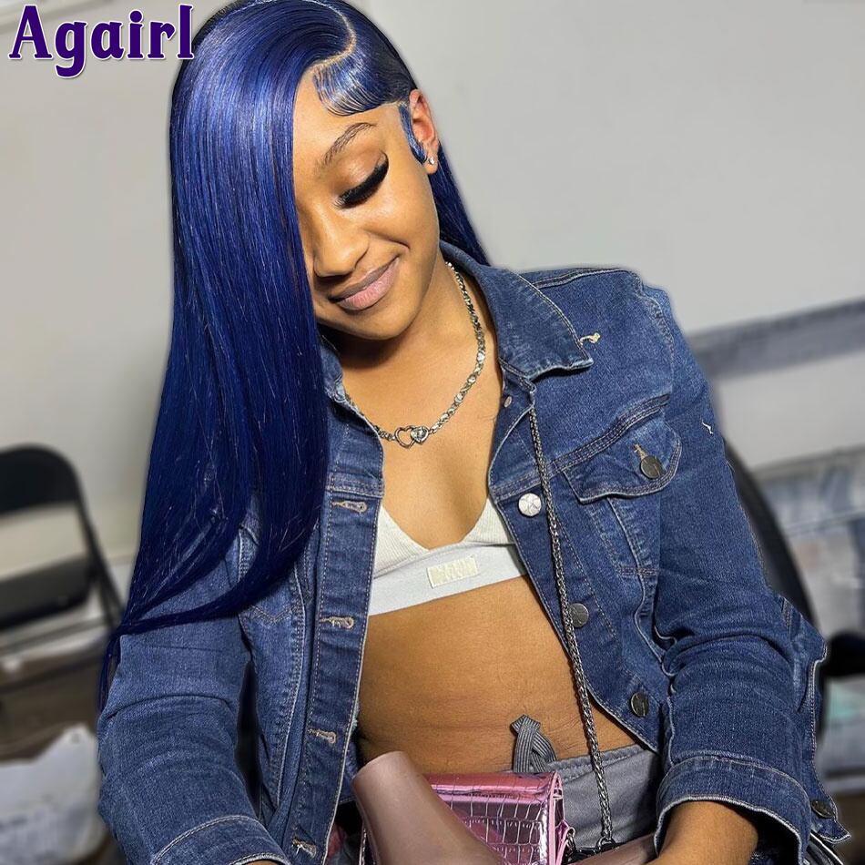 ネイビーブルーのレースフロントウィッグ,接着剤なしの滑らかな髪,13x6, 5x5, 13x4