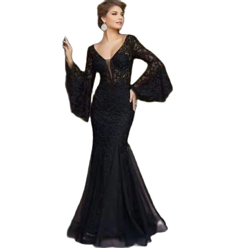 女性の単色レース刺繍フィッシュテールドレス、痩身気質イブニングドレス、プラスサイズ、黒、新しい、2024
