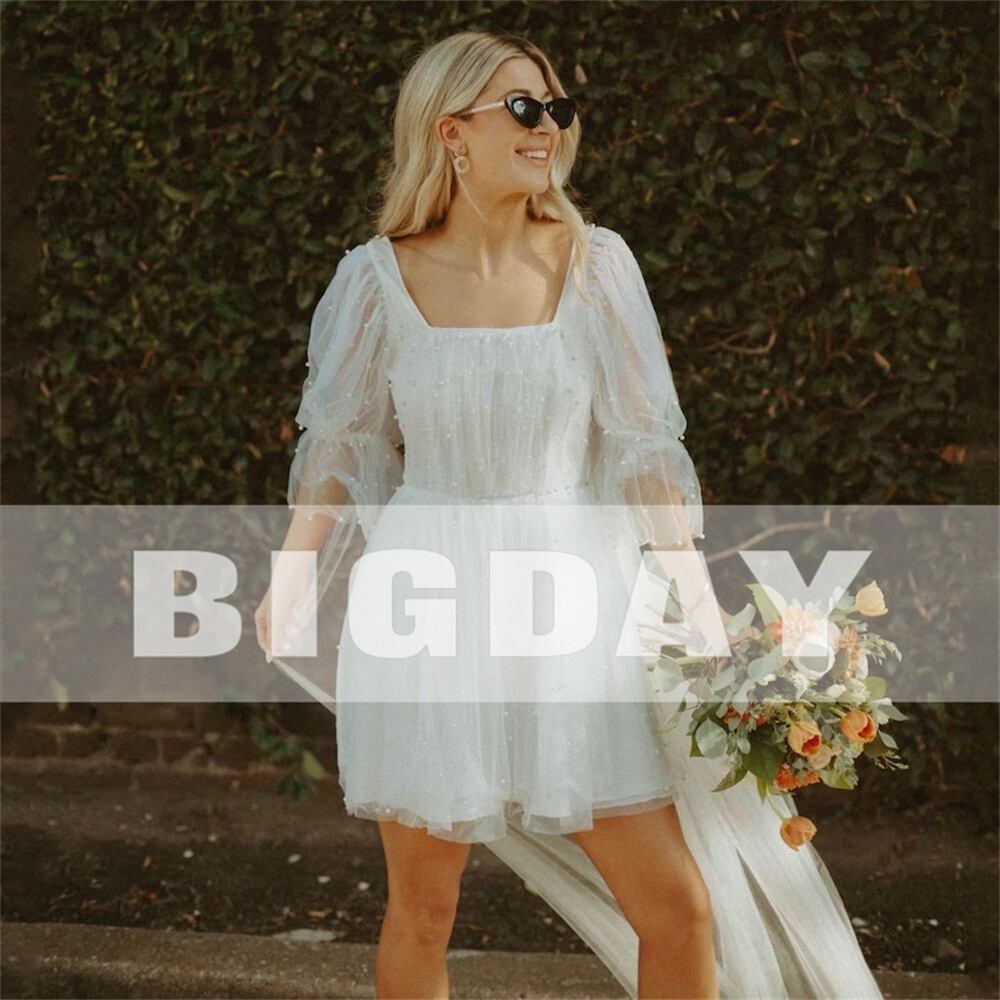 "Bigdayウェディングドレスストアへようこそ。エレガントかつ魅力的なショートウェディングドレスをご用意しております。パールとチュールプリーツがエレガントさを演出し、スクエアカラーやハーフプルスリーブがおしゃれさを際立たせます。オープンバックデザインで、背中を美しく演出できるブライダルガウンです。膝上の丈感が女性らしさを引き立てます。是非、お気軽にカスタマイズをお申し付けください。独自の工場を持つプロのチームが、お客様の理想を叶えるドレスをお作りいたします。お問い合わせやご要望がございましたら、お気軽にご連絡ください。皆様の特別な一日を華やかに彩るドレスをお届けいたします。"Bigdayウェディングドレスストアウェディングドレスの店へようこそ。