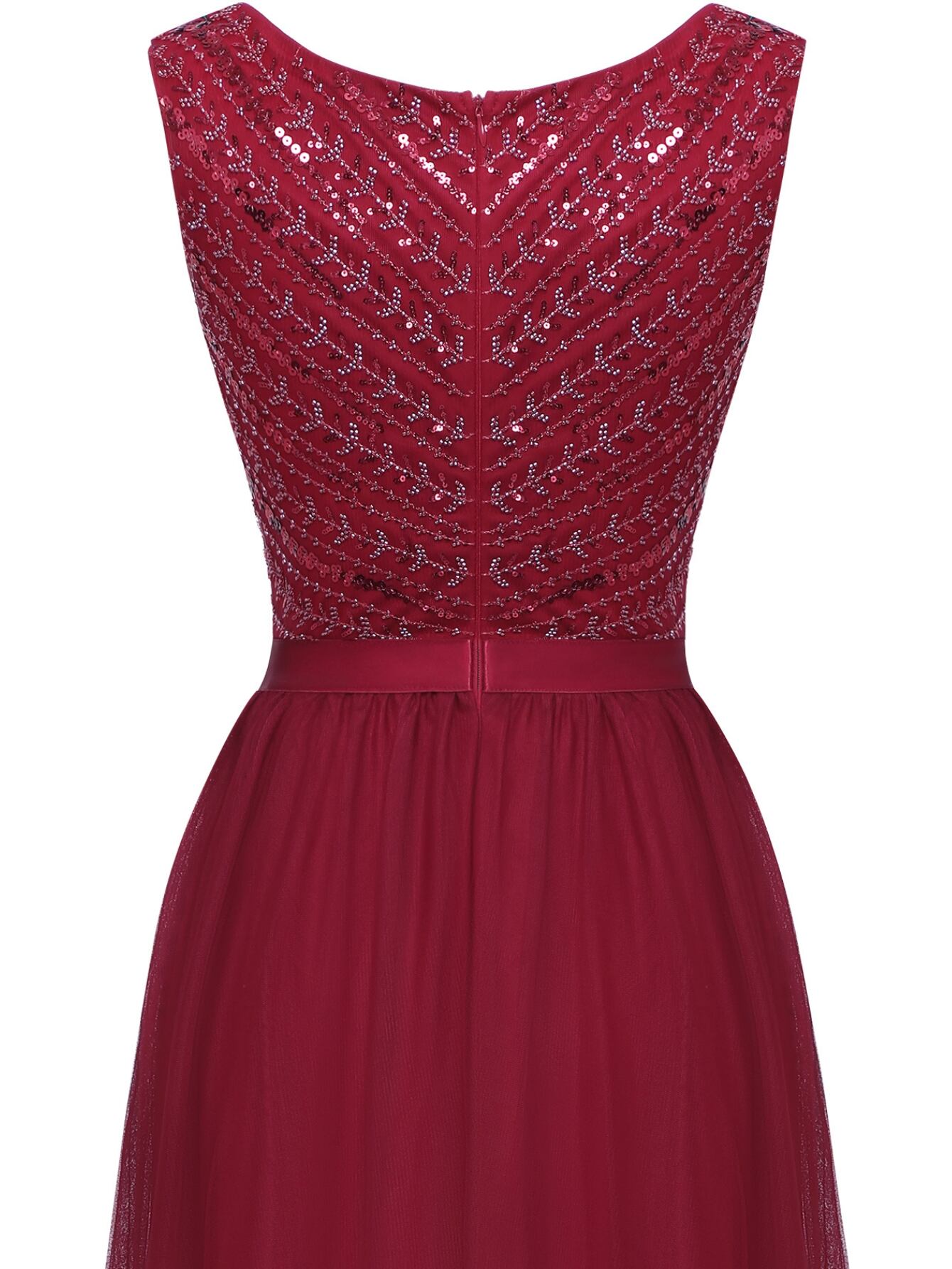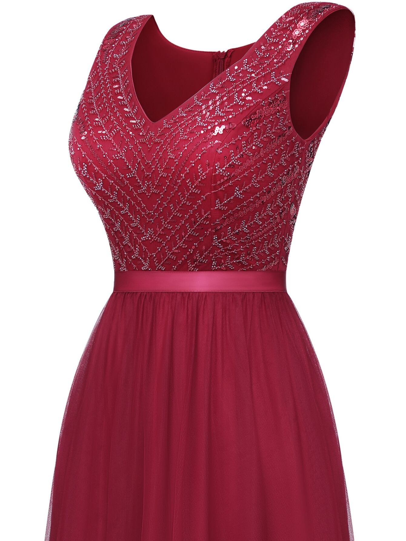 女性のバーガンディのノースリーブロングイブニングドレス、結婚披露宴のドレス、エレガントな台形のイブニングドレス
