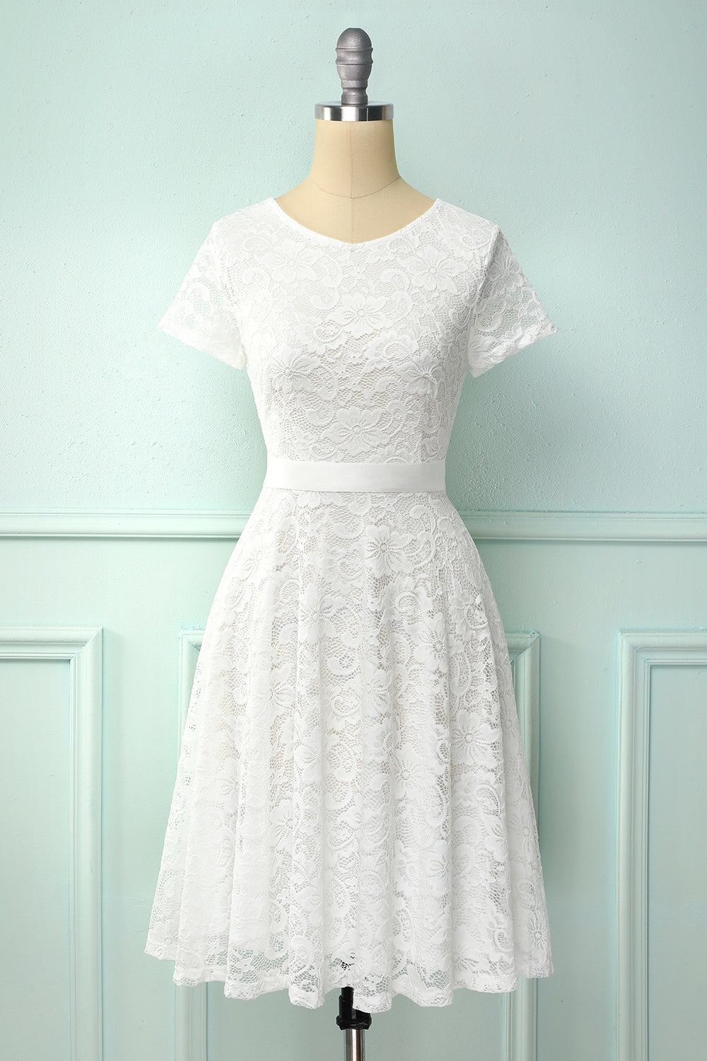 女性用半袖レースドレス,ラインa,膝丈,ショート,ウェディングドレス,ブライドメイドドレス,ホワイト