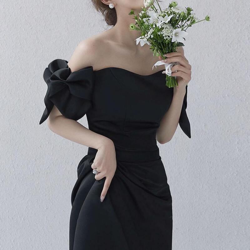 スィートボウオフショルダーウェディングドレス、エレガントなイブニングドレス、床の長さ、ライン、シンプルなサテン、黒、新しい