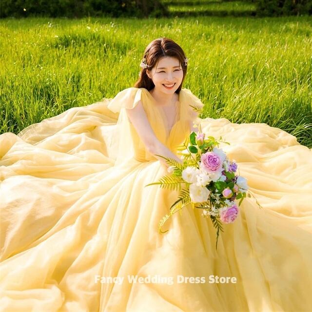 ファンシープリンセスイエローラインウェディングドレス、Vネック、ノースリーブブライダルガウン、ソフトチュールブライダルドレス、コルセットバック、韓国写