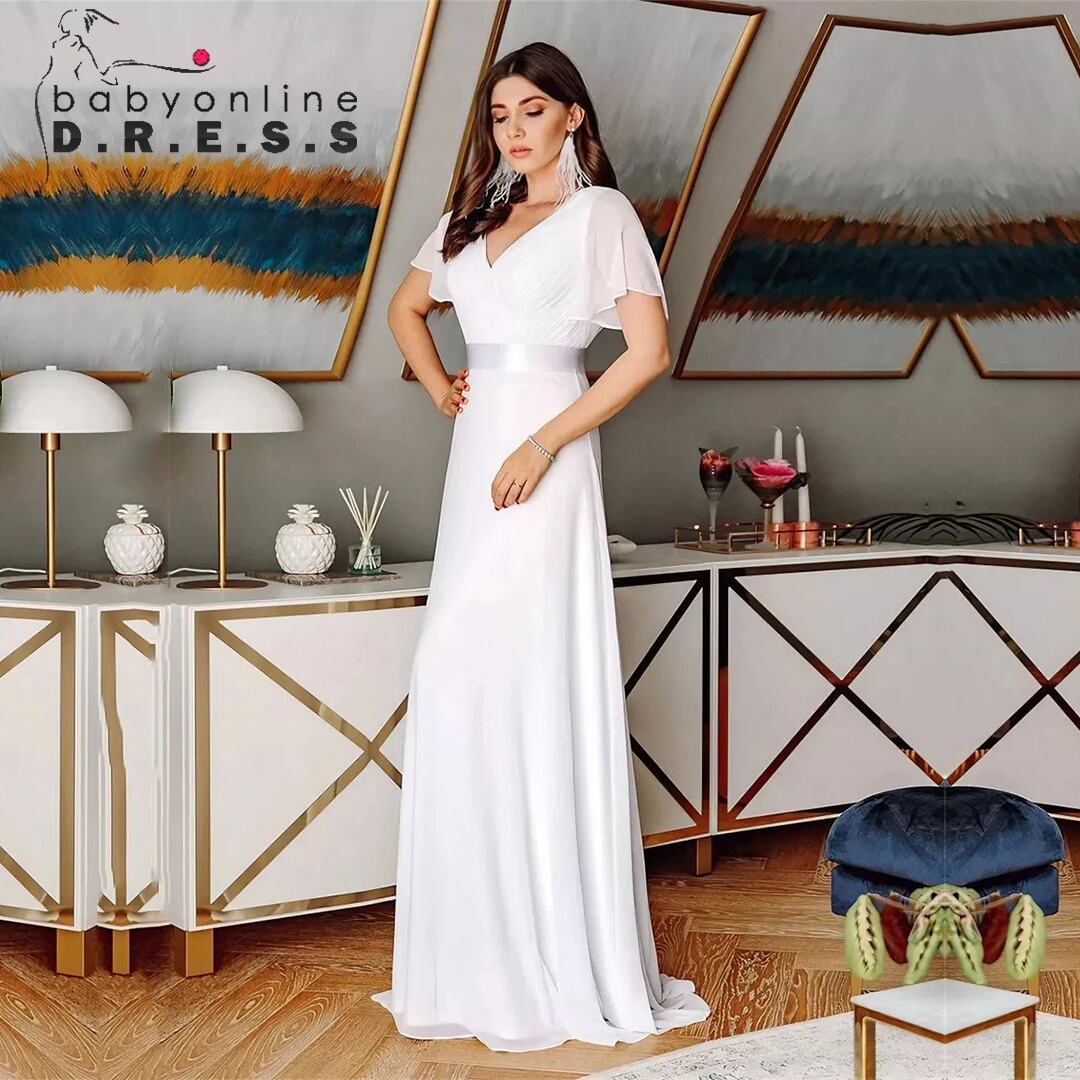ババオンライン-蝶のデザインの白いウェディングドレス、空中ブランコシフォンスカート、ノースリーブ、ダブルVネック、フリル、全長
