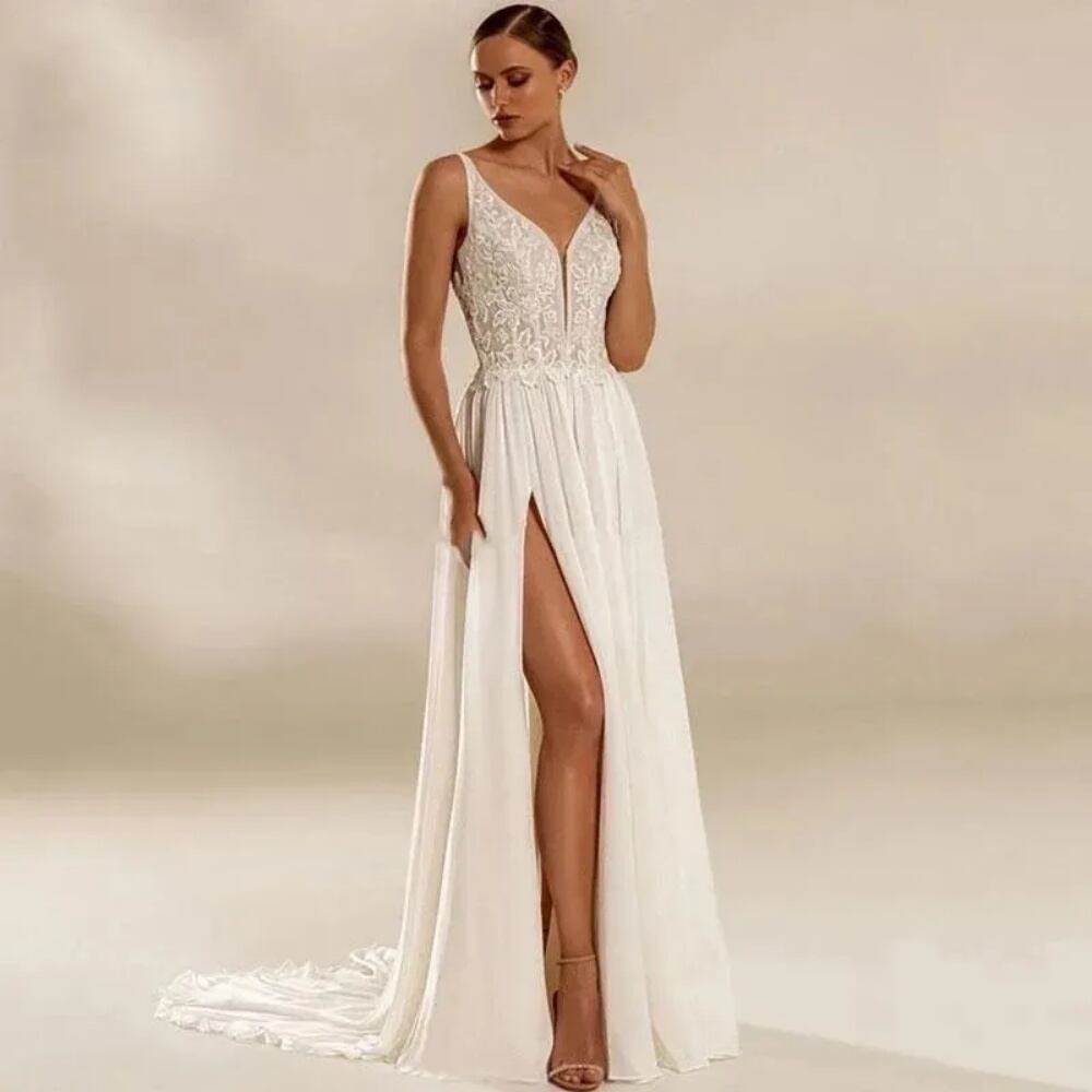 女性用シフォンドレス,Vネック,ノースリーブ,レース,Aライン,床の長さ,ブライダルガウン,ビーチ,新しいコレクション2024