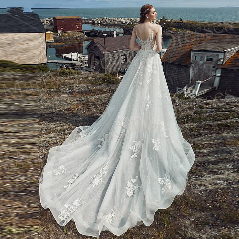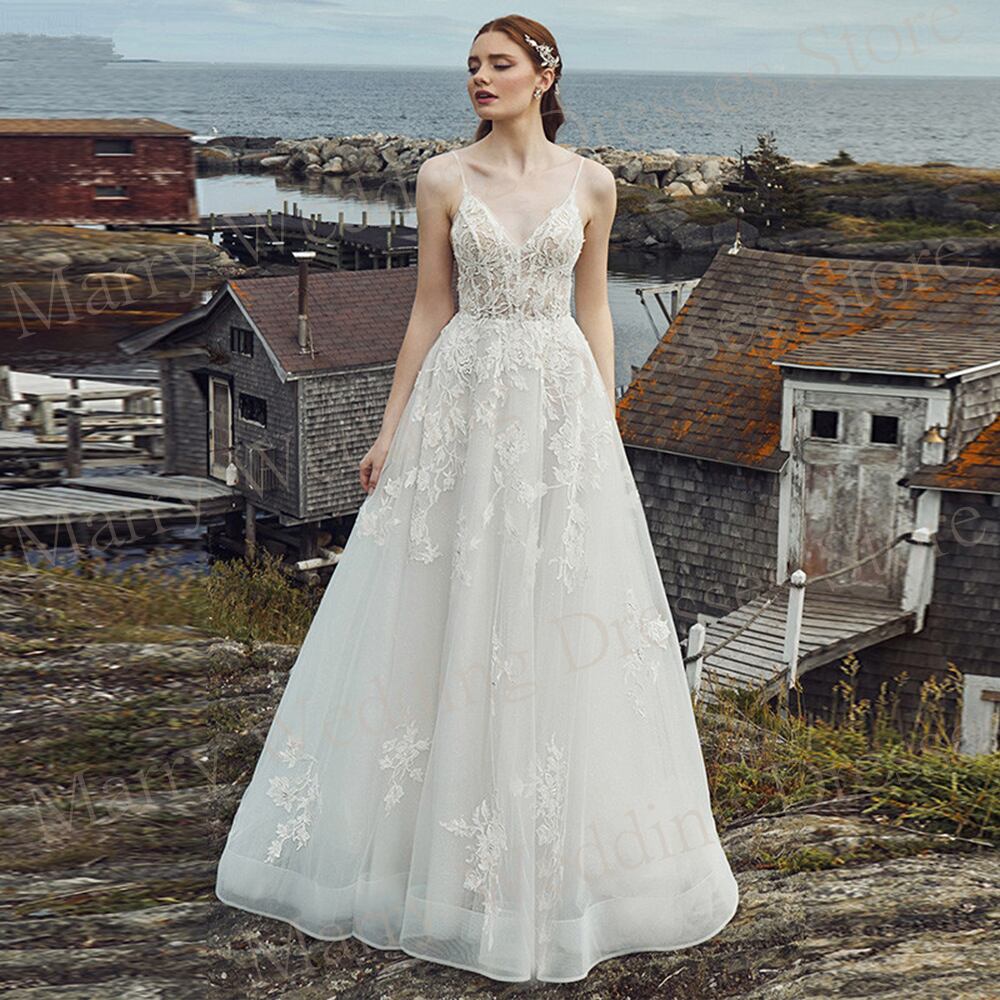 ボヘミアンラインAラインウェディングドレス、レースアップリケ、ガウン、スパゲッティストラップ、Vネック、ノースリーブ、背中の開いたドレス