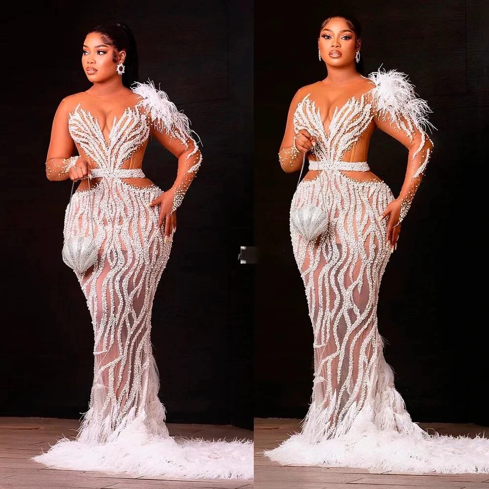 女性の白いレースのイブニングドレス,羽毛と裸の肩の袖,ボールガウン,エレガント,黒の女の子,花嫁のウェディングドレス