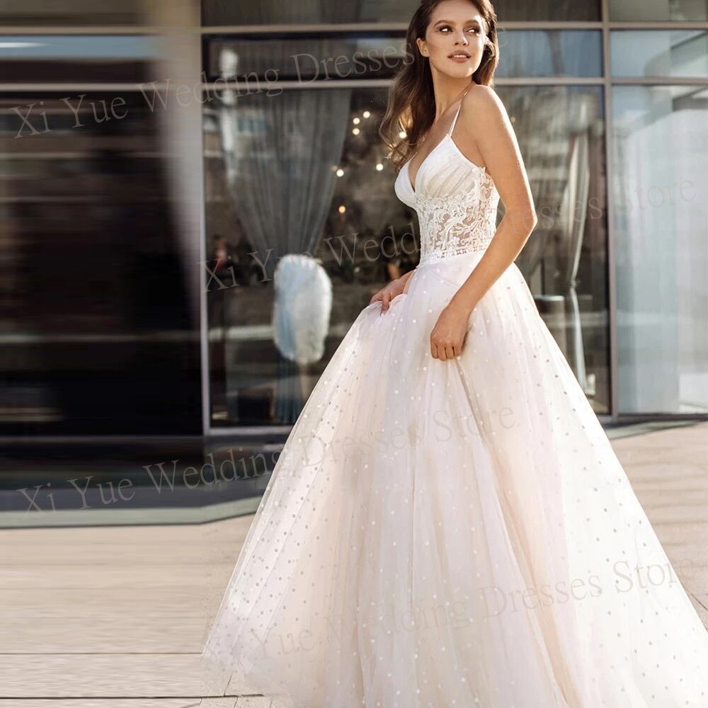 女性のための自由奔放に生きるVネックウェディングドレス,ノースリーブ,レース,アップリケ,ウェディングドレス,スパゲッティストラップ,チュール,魅力的
