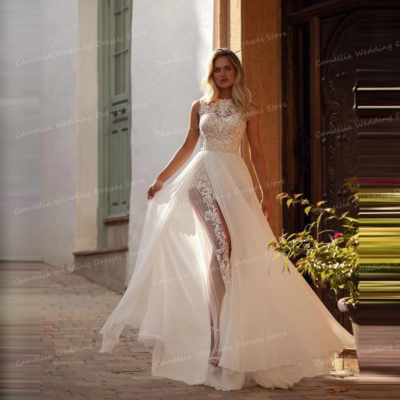 ノースリーブのウェディングドレス,ハイカラー,セクシー,スプリット,ブライダルドレス,アップリケ,サマー,2022