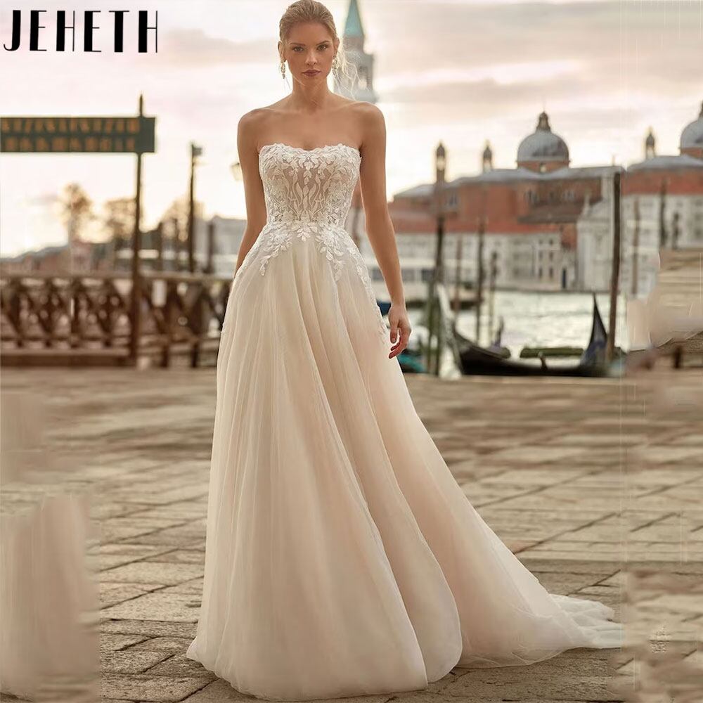 Jeheth-ストラップレスのノースリーブウェディングドレス,クラシックな空中ブランコカット,ホルター,レースアップリケ,ボタン,2024JEHETH