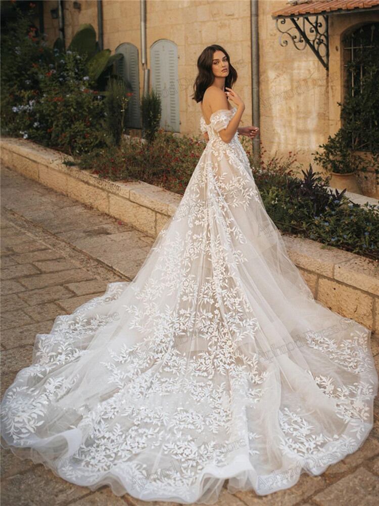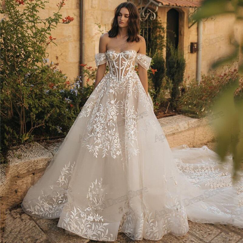 Aラインプリンセスブライダルガウン、絶妙な刺besローブ、裸の肩、床の長さ、ウェディングドレス、豪華