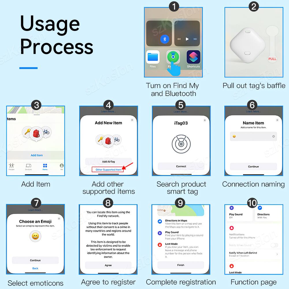 【簡単なペアリング】:szkostonラゲッジトラッカータグは非常に簡単なペアリング方法です:アプリとBluetoothを見つけて、「items」をタップしてから「additem」を開き、「その他のサポート対象アイテム」を選択し、アプリ内の指示に従ってペアリングを完了します。