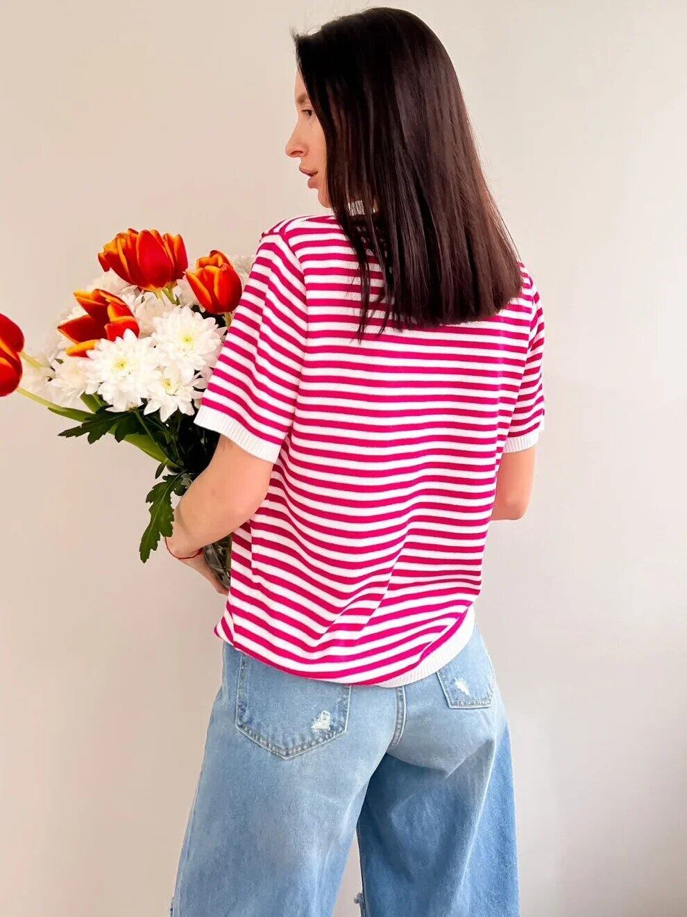 女性の基本的なストライプのニットTシャツ,ラウンドカラー,半袖,ニットトップ,韓国スタイル,夏服,オフィス,2022