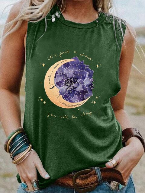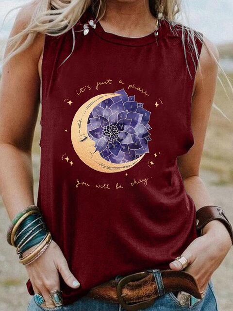 女性のヴィンテージタンクトップ、月と蓮の花、グラフィックプリント、それだけでなく、非対称、夏のファッション、カジュアル