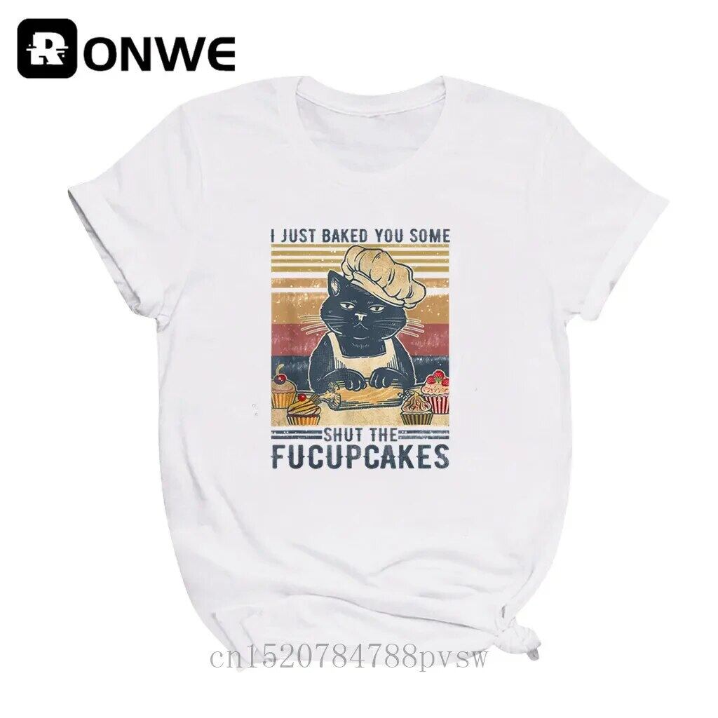 女性のレトロな猫のグラフィックTシャツ、女の子の基本的な首の黒のTシャツ、それはあなただけの飲み物を閉じています