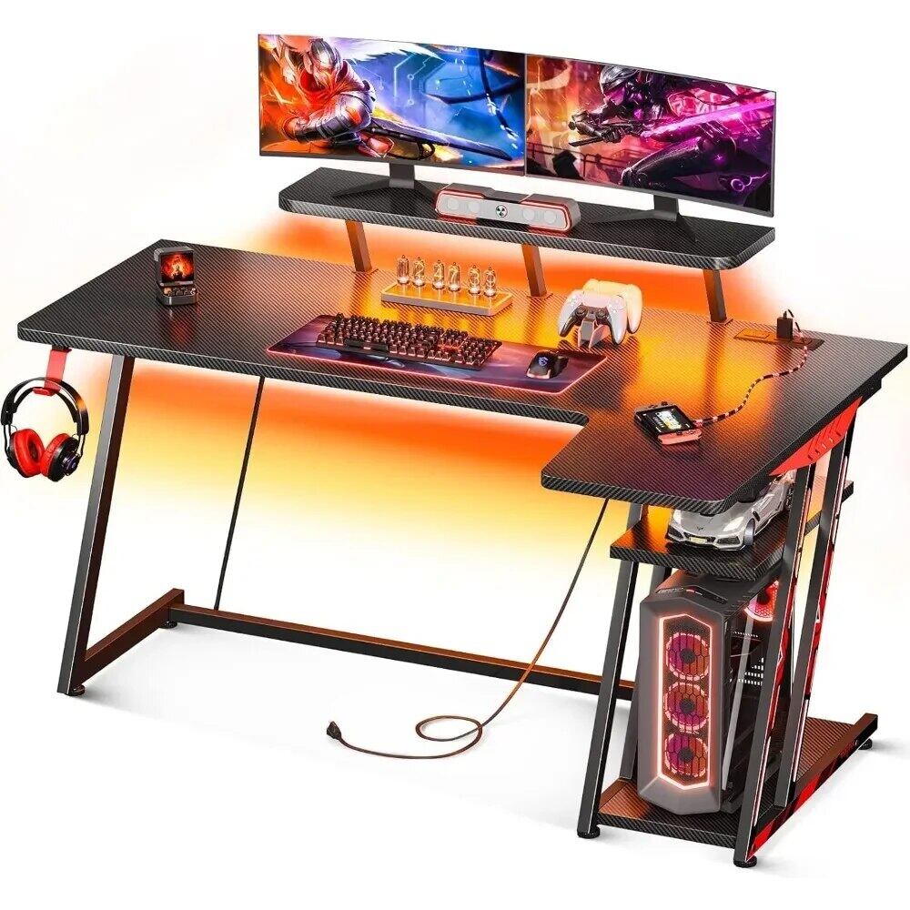 LEDコンピューターデスク,55インチ,LEDライト付きゲーミングテーブル,PC収納棚付き