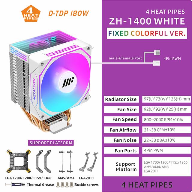 冷却を徹底するMETALFISH-CPU個と白いラジエーターが、あなたのPCをサイレント&クールにアップグレードします!4ピンとpwm対応で、intel 1700、1200、1150、1155にも対応しています。さらに、ヒートパイプ4本のZH-1400クーラーとヒートパイプ6本のZH-1600クーラーで、高い冷却効果を実感してください。ZH-1400クーラー:4つのヒートパイプ。