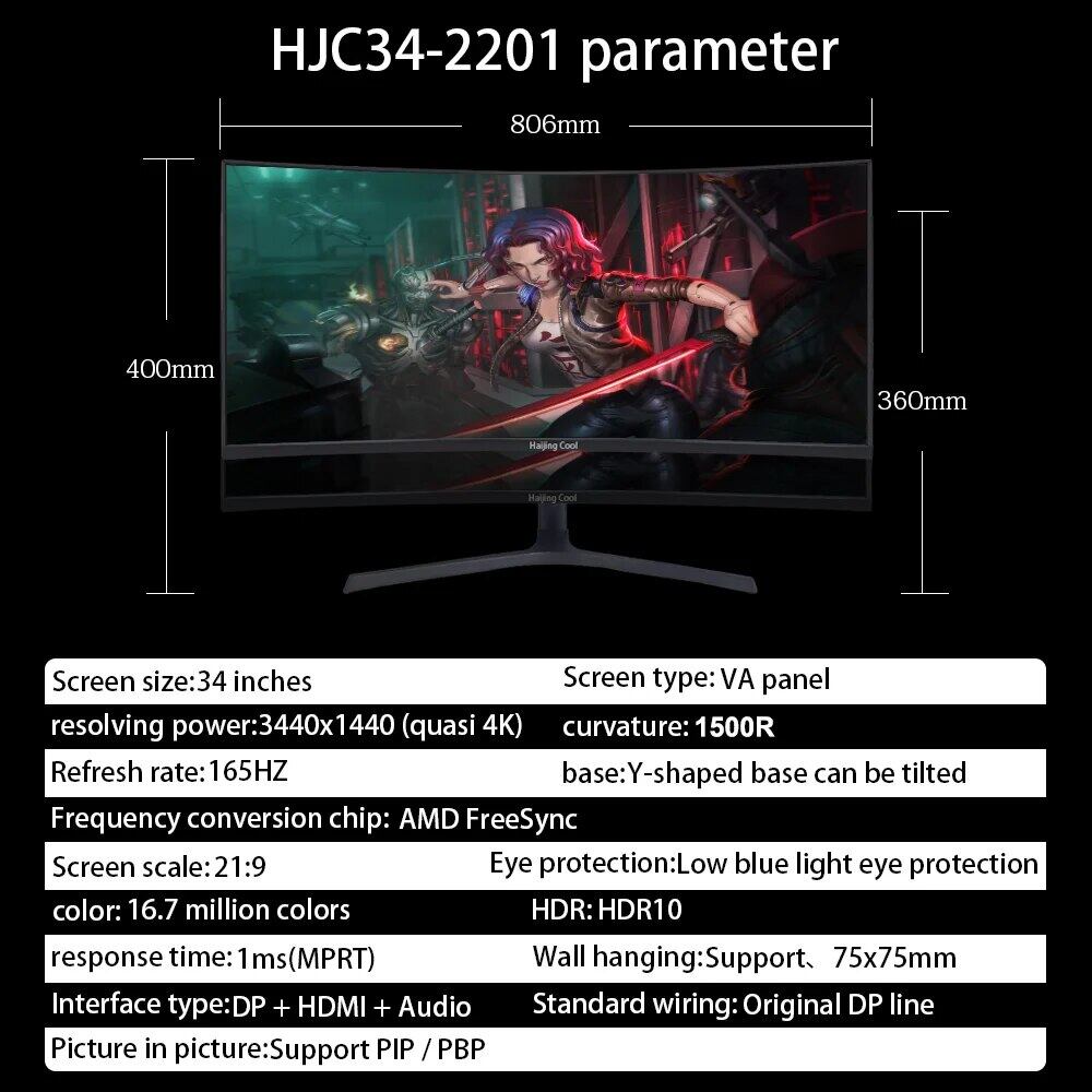 ゲーマー用のhaijing-LEDコンピューター画面、34インチ、4k、165hzワイドディスプレイ、21:9 va、144hz、wqhd、デスクトッ