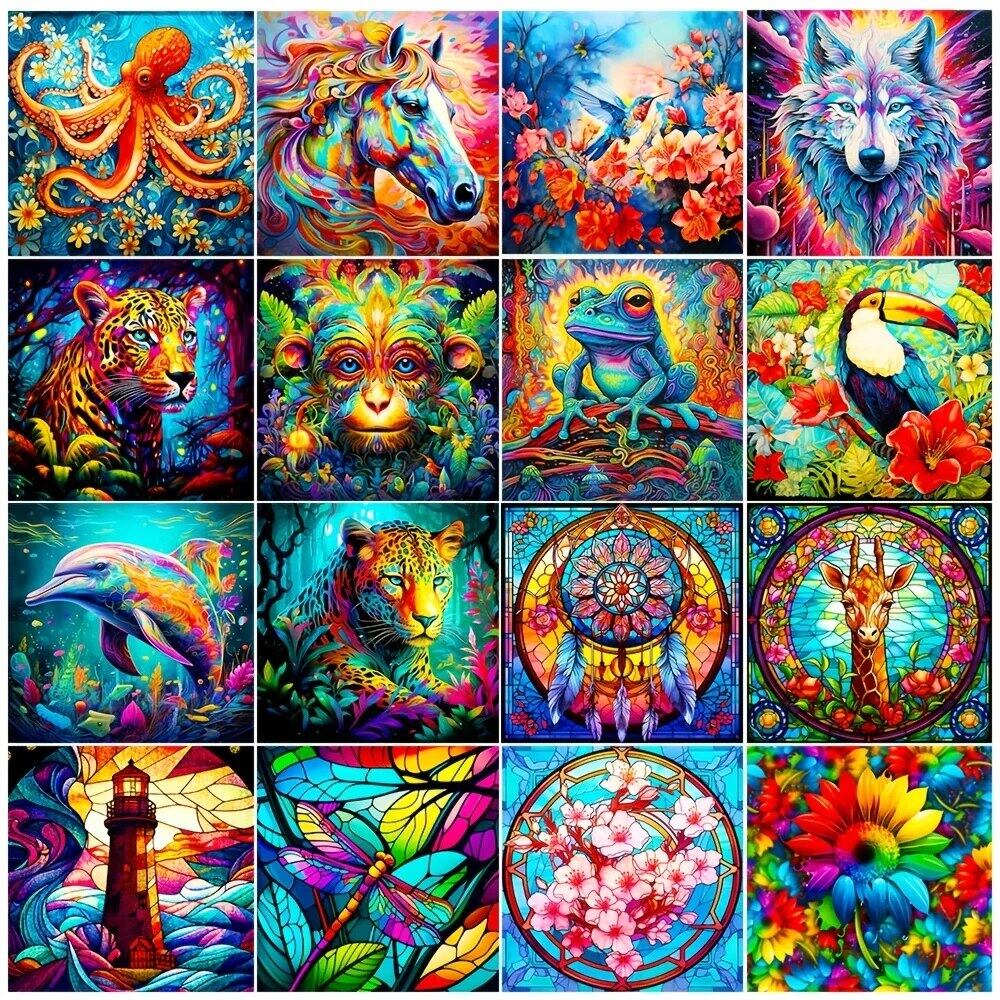 DIY 5dダイヤモンドペインティングキット、タコ、馬、オオカミ、動物の灯台、花の風景、壁の芸術の装飾、刺embroideryキット、1セット