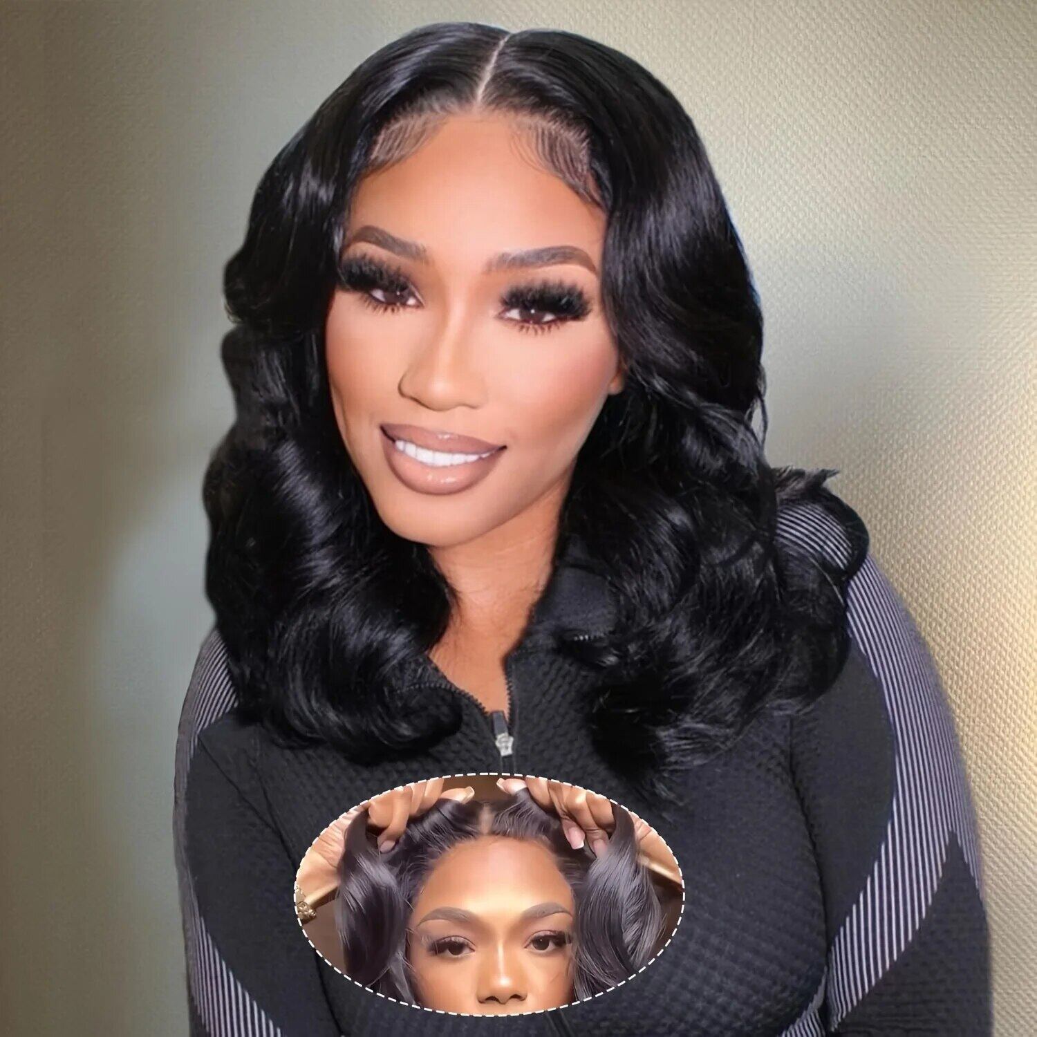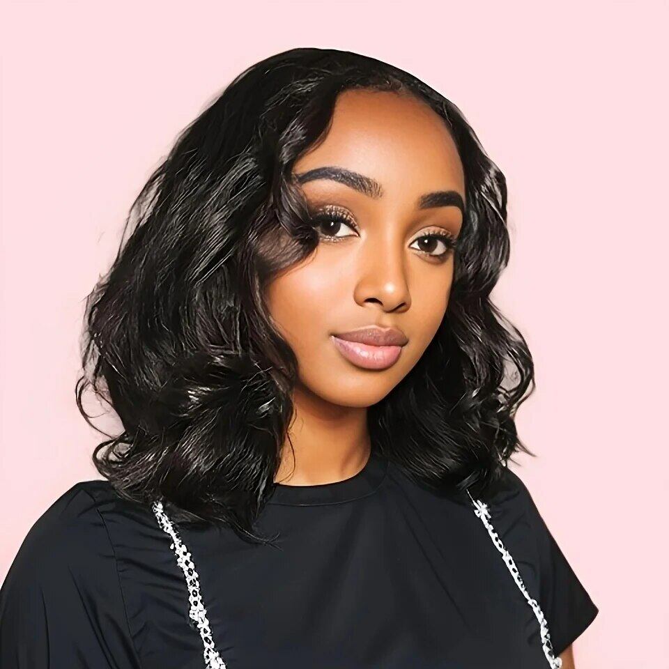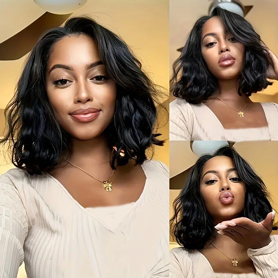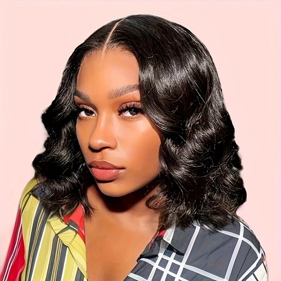 女性用レースクロージャーウィッグ、ショートボブウィッグ、グルーなしボディウェーブ、ブラジリアンレミー人間の髪の毛、透明なレースのウィッグ、ウェアとgo