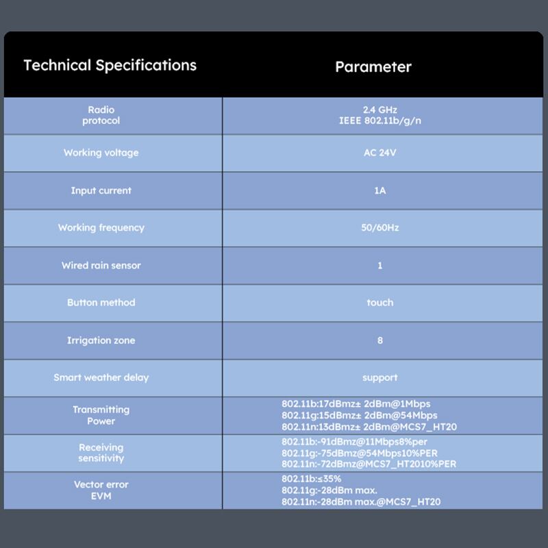 天気注意:コントローラーは自動的に天気の状態を検出し、風の強い日、雨の日、雪の日に散水計画を自動的にスキップし、水とお金を節約します。