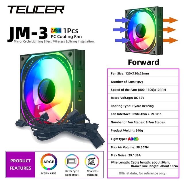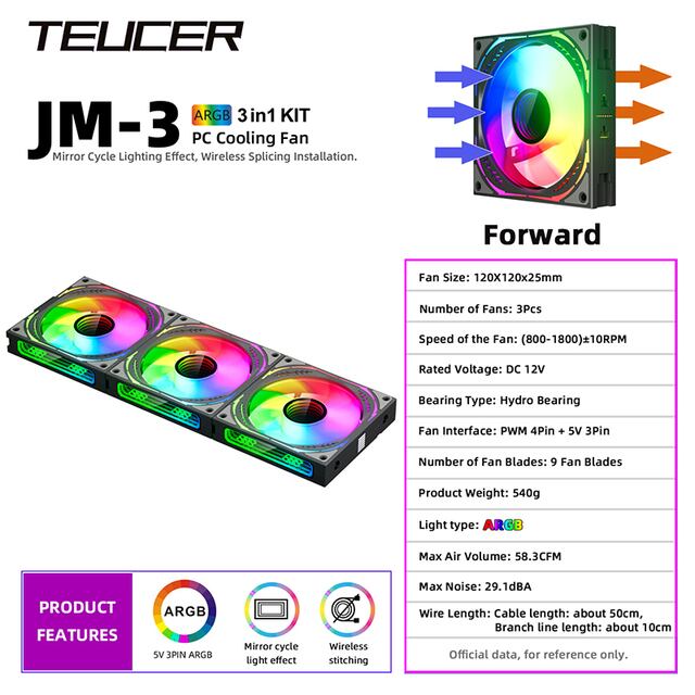 驚くほど静かなファン体験を提供する「TEUCER-JM3 mm」の水冷ファンをお見逃しなく!120mm×3の360mmサイズで、無限のスペースを確保。5vの接続で迫力のあるARGBライティングを楽しめます。優れた冷却性能で、パソコンの動作も安定!せっかくのパソコンもっと涼しく、もっと快適に。プロダクトパラメーター定格電圧:DC12vLight型:argbファンサイズ:120x120x25mm回転速度:800-1800rpm±10%ベアリングタイプ:油圧ベアリングファン容量:最大58.3cfm定格電流:0.16aノイズレベル:最大29.1dbaファン空気圧:最大2.05mm/h2o絶縁タイプ:クラスaファン数量:3個電源コネクタ:4ピン/3ピン機能TeucerJM-3コンピューター冷却ファンキットは革新的なファンフレームスプライスロックデザインを採用しており、JM-3はより便利で安定した導電性を備えた直接接触コネクタを採用しています。