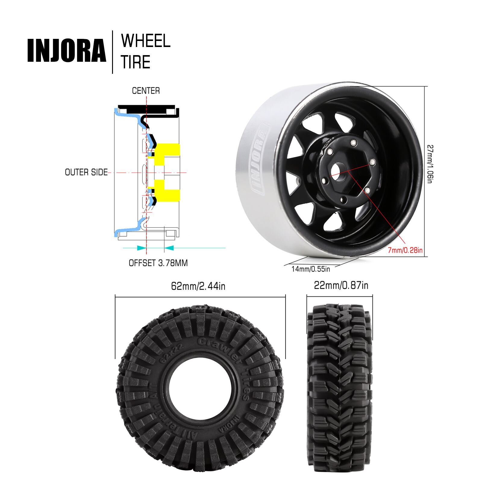 魅力的な新商品、[Injora-3.78ミリメートルオフセット1.0 \]が登場!高品質のスチールホイールと柔軟なバイアスプライ構造を採用し、極上の耐久性とトレッドの柔軟性を実現しました。他にはない超柔らかく粘着性の高いinjoras5コンパウンドで成形され、モデルカーの性能を格段に引き上げます。まさに1/18および1/24スケールのモデルカーやクローラーに最適なサイズで、インジョーラのパーツ番号が証明する高品質をお楽しみください。見た目も素敵で、タフな仕様と軽量設計であなたのRCカーライフを華やかに彩ります。家族や友人との楽しい時間にぴったりな一品です。機能:負のオフセット-3.78mmホイールリム高品質のスタンプスチールホイール製Injora1.0"62*22mmクローラータイヤ優れた耐久性とトレッドの柔軟性のための頑丈なバイアスプライ構造超柔らかくて粘着性のあるinjoras5コンパウンドで成形1/181/24rcクローラーscx24fcx24ax24に最適なサイズリムの仕様:パーツ番号:w1004素材:スチールオフセット:-3.78mm(-0.15in)外径:27mm(1.06in)幅:14mm(0.55in)ホイールハブ:7mm(0.28in)各重量:15グラム/ピース(0.53オンス)タイヤ仕様:パーツ番号:t1014Compound:injoras5(超ソフト&スティッキー)素材:ゴム外径:62mm(2.44in)幅:22mm(0.87in)各タイヤ重量:15g(0.53oz)パッケージリスト:4*rcカー1.0"リム4*rcカー1.0"タイヤwindow.adminAccountId=2662802312;