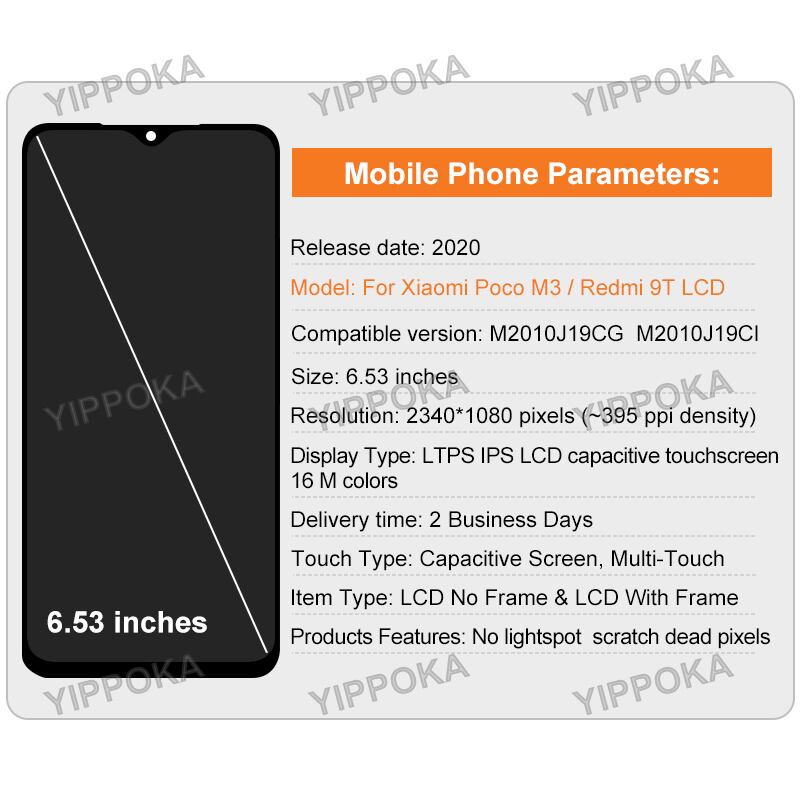 「高品質な液晶画面の組み立て、Xiaomi Poco m3、Redmi 9T向けLCDタッチスクリーンパネルが登場しました!あなたのスマートフォンのスクリーンを交換して、また新しいように楽しんでください。さらに、一括注文をご希望の場合はお気軽にお知らせください。お得な価格で最高の品質を提供いたします。速やかにご注文いただければ、安心の発送と確実なサポートをお約束いたします。あなたの大切な携帯電話を今日新たな輝きに導きましょう!」説明:1.高品質の液晶画面の組み立てXiaomipocom3/redmi9tlcd用モデル:m2010j19cg,m2010j19ci/j19s,m2010j19sg,m2010j19sy(必要に応じて適切なオプションを選択してください。