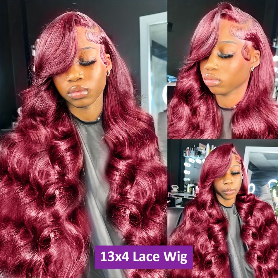 ボディウェーブレースウィッグ,女性用ナチュラルヘアウィッグ,バーガンディ,透明HD,事前に摘み取られた,30インチ,13x4, 13x6, 99j