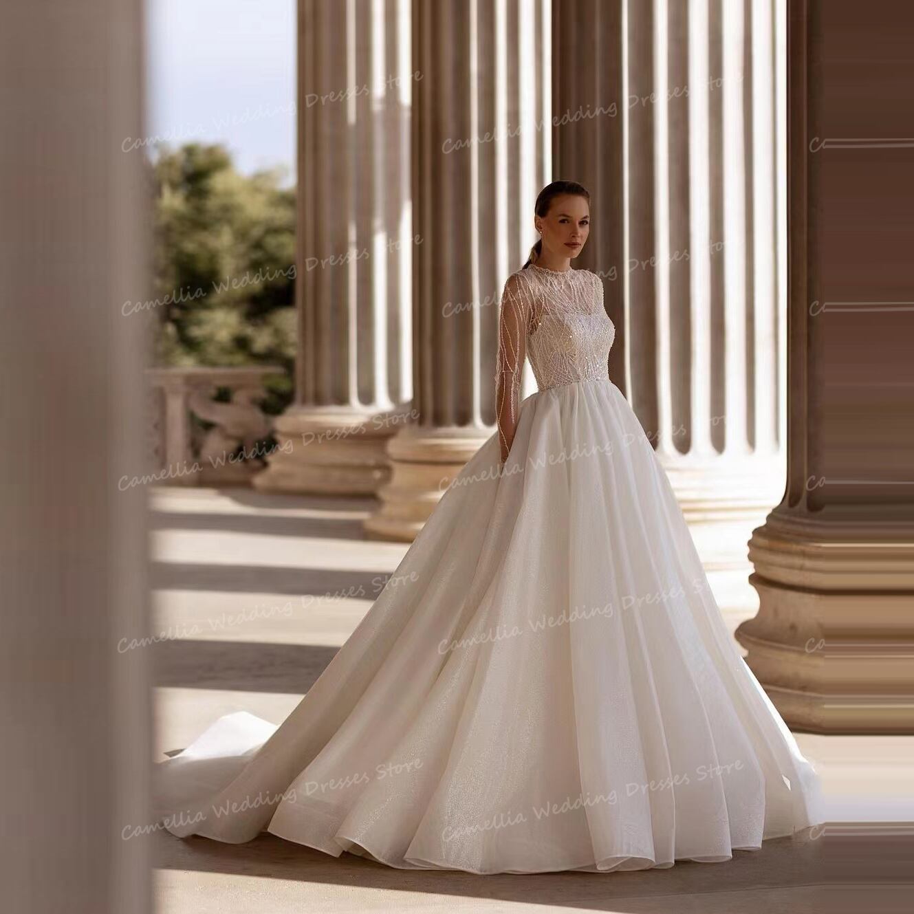 セクシーなスパンコールのウェディングドレス,長袖,チュール,ハイネック,女性用