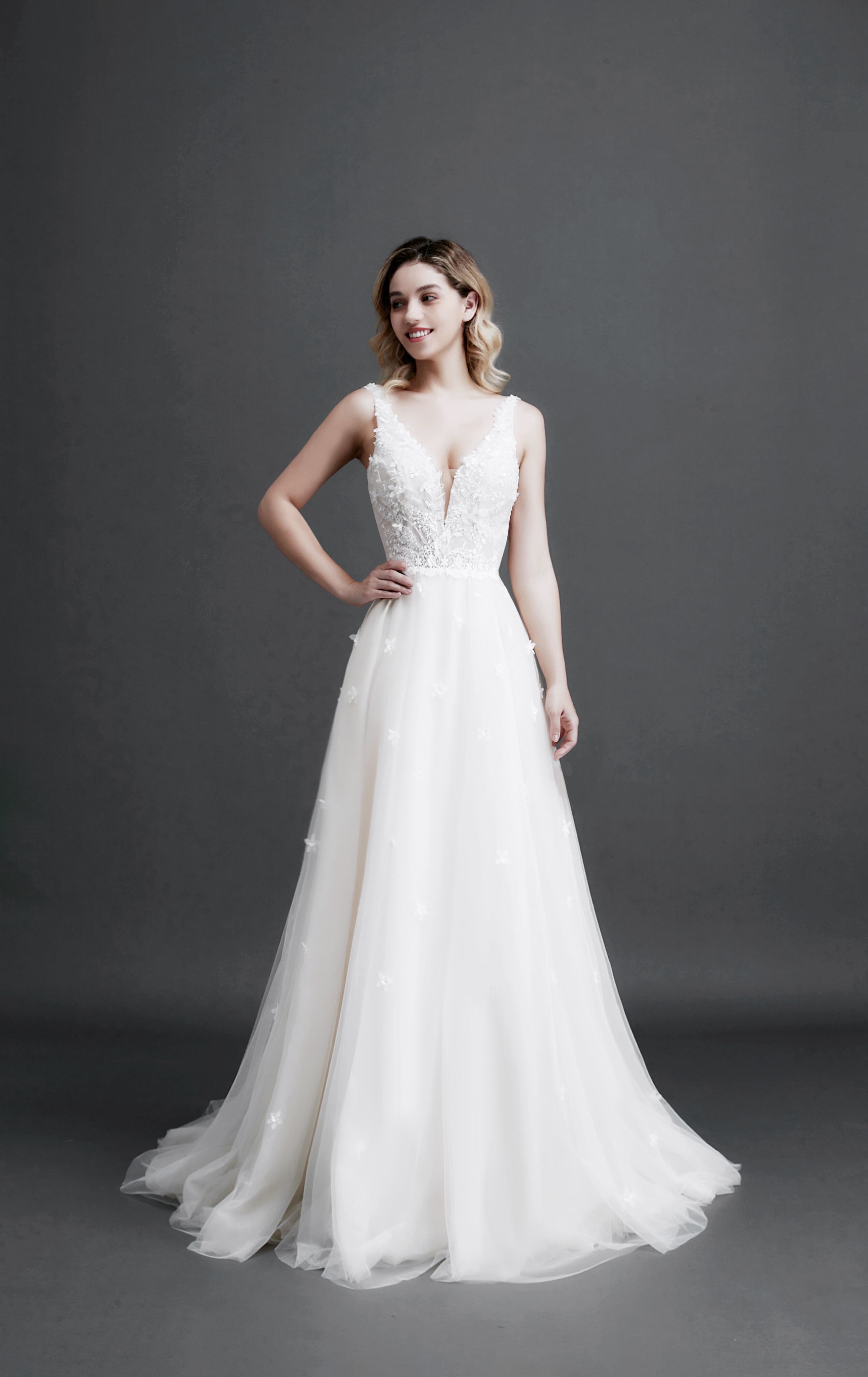 自信を持って輝くための、セクシーでロマンチックなウェディングドレスが登場しました。Vネックのデザインと背中の大胆な裸の背中が魅力的。花のアップリケと上品なパールが華やかさを演出します。自分らしさを表現したいあなたにぴったりのドレスです。[date]. 是非、新しいウェディングスタイルを体験してみてください。最初の写真は参考用です。