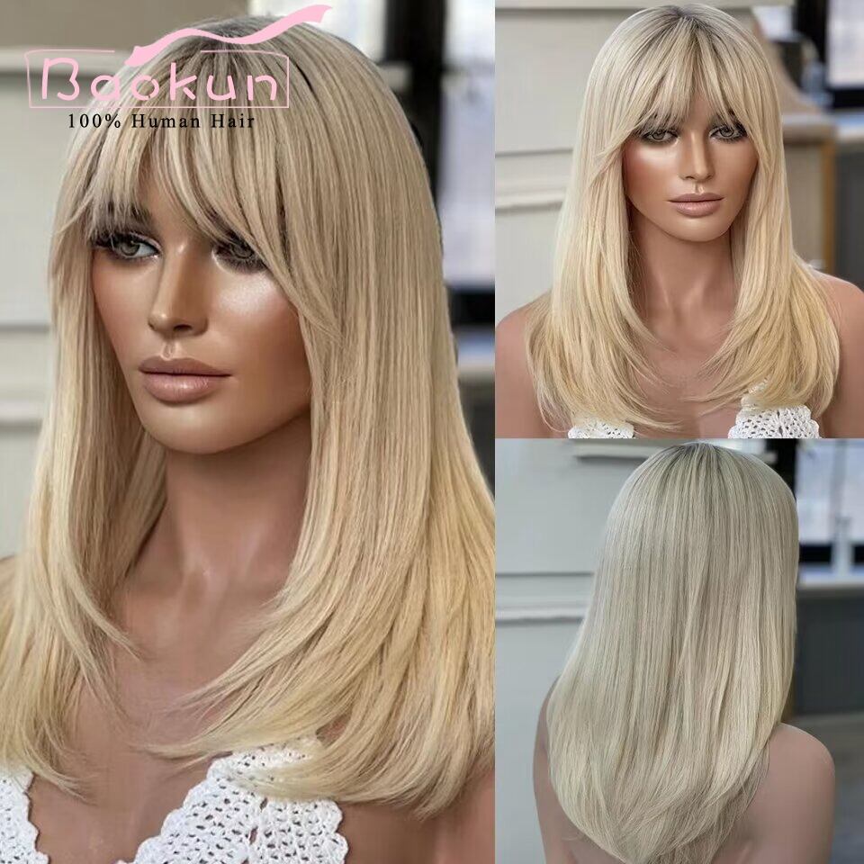 「魅力的なライトブロンドの人毛ウィッグが新登場!フリンジ付きでさらにおしゃれ度UP!接着剤不要のボブスタイルは、200%の豊かなボリュームで自然な立体感を演出。ライトブロンドカラーの美しい陰影が、あなたの髪を一層輝かせます。さらに、調整可能なストラップ付きなので、自分にぴったりのフィット感を実現。通気性抜群のヘアキャップと耐久性のあるレースで、快適な装着が可能です。このウィッグで、自然な美しさを手軽に叶えてみませんか?」フリンジ付きの滑らかな人間の髪の毛のかつら,陰影のあるライトブロンドのボブスタイル1.ヘア密度:130%150%180%200%密度。