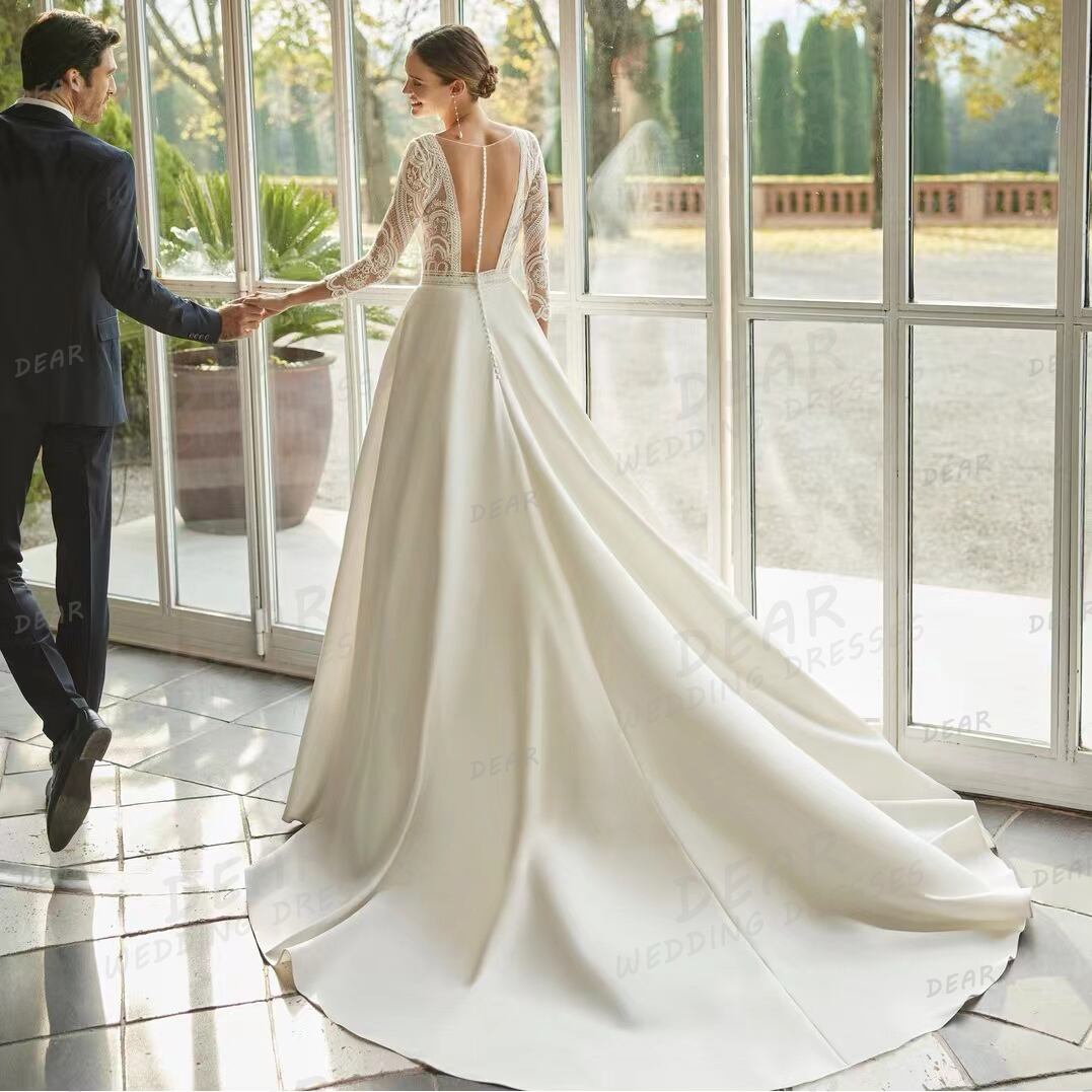女性のためのエレガントなVネックのウェディングドレス,裸の背中のドレス,サテン,セクシー,電車,エレガント